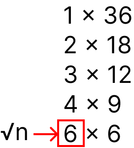 n = 36 일 때 n의 약수를 i * i <= n 까지만 확인해도 되는 이유는